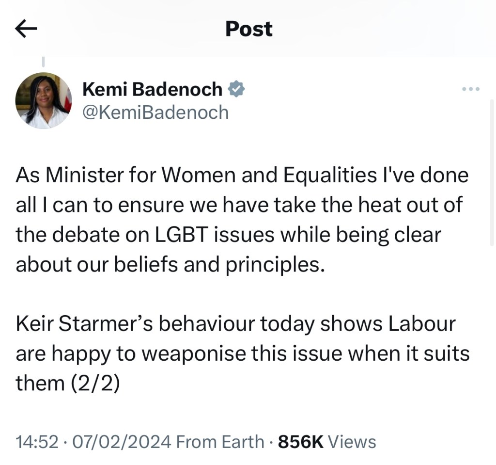 Kemi Badenoch wrote two tweets claiming that Starmer trivialised Brianna Ghey’s murder for political point-scoring. In the same tweet, she wrote “It was shameful of Starmer to link his own inability to be clear on the matter of sex and gender directly to her grief”, stating later in the thread that “Starmer’s behaviour today shows Labour are happy to weaponise this issue when it suits them”[7].
