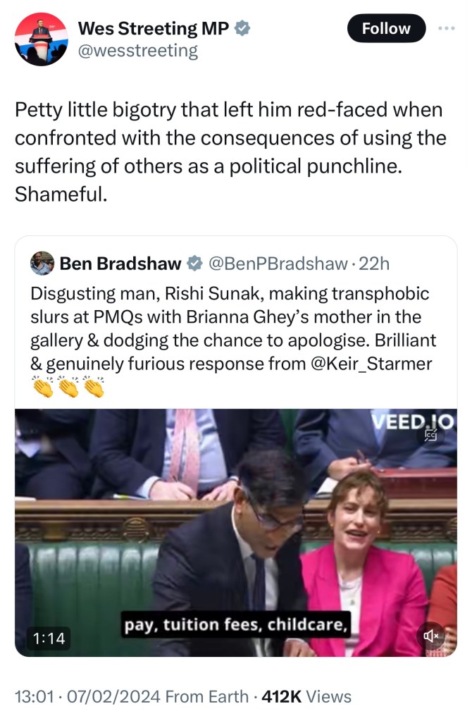 It does not matter that Sunak has brought up the particular attack line around “what is a woman?” in PMQs on multiple occasions, and Starmer is still yet to answer or addressed his transphobia. Only when it is politically viable to demonstrate his rationality, does he then become the saviour and defiant out-speaker.
